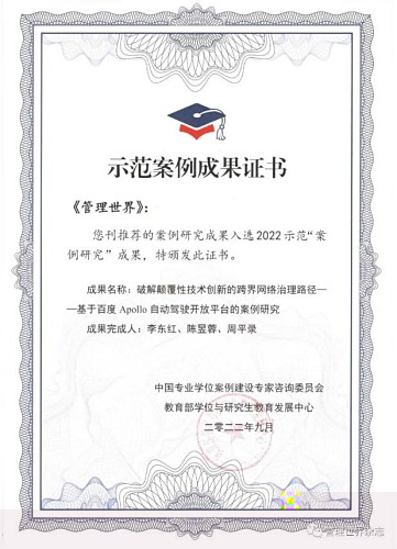 2022年9月17日,由教育部學位與研究生教育發展中心、beat365公共管理學院聯合主辦的首屆中國案例建設國際研讨會(2022)舉行。會議期間首次發布了“案例研究”典型成果和“主題案例”典型成果。清華經管學院創新創業與戰略系李東紅教授團隊發表的論文《破解颠覆性技術創新的跨界網絡治理路徑——基于百度Apollo自動駕駛開放平台的案例研究》獲評2022年示範“案例研究”成果。