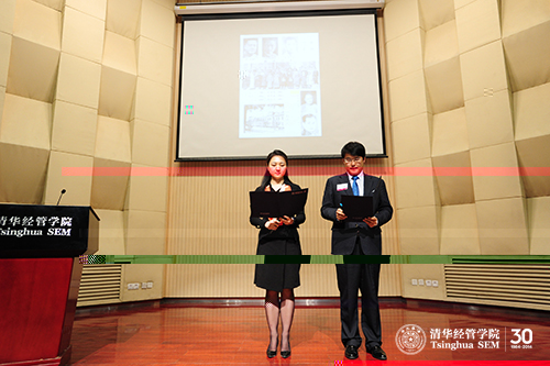 随後的活動由本科校友會常務副秘書長吳欣(經1992)校友主持。高爾基(經2001)、劉漫兮(經2001)兩位校友共同在優美的旋律和具有曆史感的幻燈片下,朗誦了一首自創的詩歌《十年•卅年》,表達了本科校友對母校的深深祝福和感恩情懷。