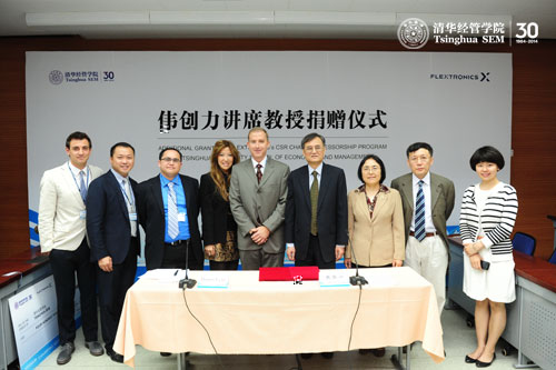 2013年6月7日上午,偉創力講席教授捐贈儀式在清華經管學院舉行。偉創力全球人力運營高級副總裁Thomas Ezrin先生、偉創力亞洲企業市場營銷與傳播資深總監Valerie Kurniawan女士、清華經管學院院長錢穎一教授、院長助理錢小軍教授和合作發展辦主任潘慶中老師等出席了捐贈儀式。