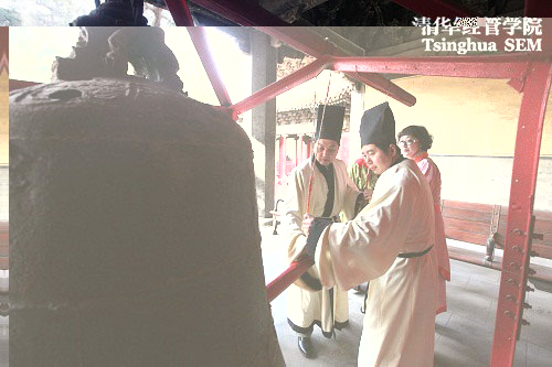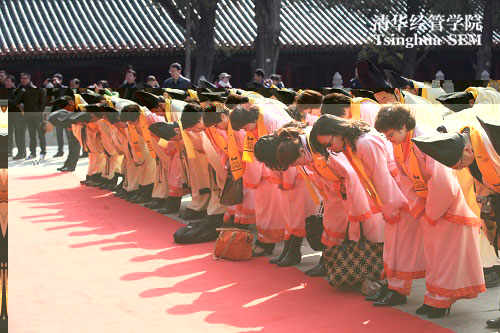 3月14日上午,同學們來到曲阜孔廟,身着傳統漢服,在孔廟祭司的主持下參加祭拜孔子儀式暨國學班(第四期)開學典禮。清華EMBA教育中心執行主任王勇,副主任孫美琦,國學班(第四期)班級主管惠心,以及“儒”模塊特邀授課教師美國維吉尼亞大學講座教授陳明哲、台灣大學教授孫中興一同參加了祭孔儀式及開學典禮。