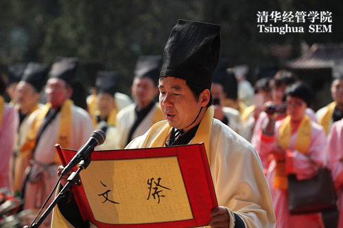 儀式伊始,王勇、孫美琦以及07-A班校友鄭靜晨一同擊古鐘三響,以示國學班第四期正式開課。随後,王勇代表所有參加祭孔儀式的師生莊重誦讀祭孔祭文,并代表EMBA教育中心向參加國學班課程的同學們表示歡迎,希冀同學們在接下來逾一年多時間,通過七個模塊的國學研修,學養精進更上一層樓。