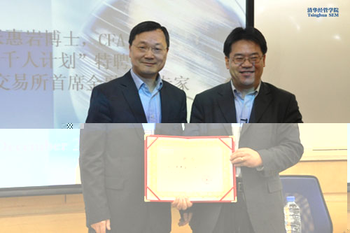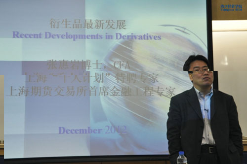 2012年12月13日,上海期貨交易所首席金融工程師張惠岩做客清華經管學院,在“清華金融行業導師論壇”上發表了題為“中國的金融衍生品創新與應用”的演講。他認為,國内對沖基金時代終于到來,未來十年都會是對沖基金迅速發展的一個時期。清華經管學院副院長郦金梁為其頒發了導師證書。