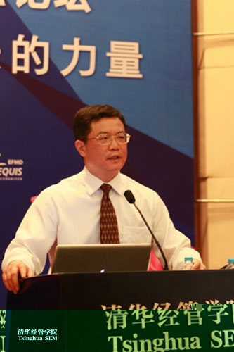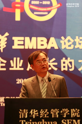 清華經管學院院長錢穎一教授緻辭,他提到,經過十年,清華EMBA已經成為中國最具綜合實力、最具口碑人氣、最具影響力的EMBA項目。清華EMBA一直以培養産業領袖塑造企業未來為使命,十年來,清華EMBA形成了五大優勢:強大敬業的師資陣容,廣泛而雄厚的國際合作資源,精緻的課程設計,嚴明的教學管理以及充滿凝聚力的校友網絡,這些優勢已經成為清華EMBA品牌和聲望的集成。同時,他還表示,清華EMBA具有三大特點: