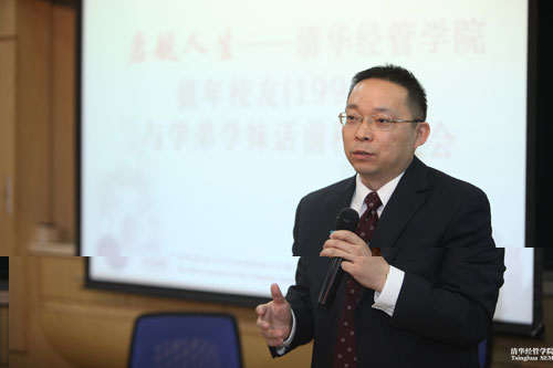 清華經管學院黨委副書記焦捷教授首先緻辭。作為本科1991級的學長,他首先感謝百忙之中返校與在校生交流的校友,并深情地回憶起當年與本科1992級的同學們一起上課、踢球的場景。他希望學院薪火相傳的校友文化能夠繼續傳承下去,在校同學能夠在交流中有所得。
