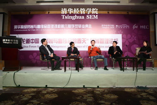 除了教授嘉賓的精辟見解,來自時尚與奢侈品行業及相關行業的清華校友也紛紛加入讨論:特邀嘉賓HTC中國區副總裁林祖榮、上海晨錦咨詢公司總經理張喆、時尚課程三期校友李甯公司服務總監林雲、六期學員深圳季候風服飾公司董事副總經理吳興國、六期學員上海星客特汽車銷售公司總經理高峰等校友從各自角度讨論了中國時尚品牌的國際化之路,以及奢侈品營銷的創新之道。