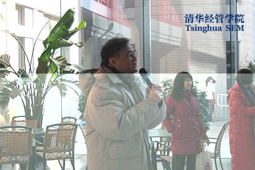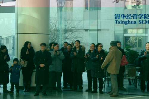 1月23日(農曆正月初一)上午,舜德樓大廳一派喜氣洋洋的節日氣氛。院長錢穎一、副院長白重恩等與近百名學院教職員工及家屬歡聚一堂,互緻問候,共迎龍年的到來。庭院中早已環繞園景放置好的鞭炮由錢院長親自點燃,頓時鞭炮聲響徹庭院,震耳欲聾,映襯出大家辭舊迎新的愉悅心情。