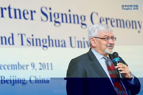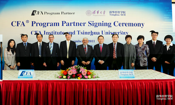 在當日下午舉行的合作簽字儀式上,學院黨委副書記焦捷教授和CFA協會理事Charles Yang 先生分别緻辭。焦捷教授和CFA協會亞太區董事總經理艾博科博士代表雙方簽署合作協議。CFA協會副理事長Alan Meder 先生、理事Aaron Low博士和理事邵征女士及清華經管學院2011級金融專業碩士學生代表參加了簽字儀式。