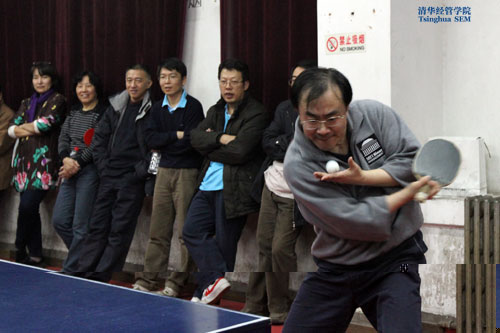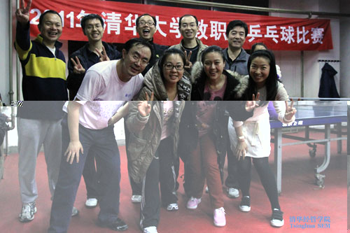 經管學院教職工乒乓球隊由張力軍、鄭曉明、潘文卿、孟嶺生、劉慶、鐘笑寒、何平、高俊華、苗偉、林雅莉組成。本屆聯賽于11月14日拉開序幕,在小組循環賽階段,經管學院以5:0的相同比分分别完勝汽車系和清華附中隊,雖 1:4不敵離退休隊,仍以小組第二的成績進入淘汰賽。淘汰賽階段迎接挑戰的都是清華的傳統強隊,在近十年的交鋒中,經管學院還從未取得過勝利。面對強大的對手,隊員們精心布陣,放手一搏,先後以兩個3:2淘汰了核研院隊和校機關隊,再以 3:1勝微電子隊,最終挺進決賽。決賽中,經管學院隊遭遇了實力雄厚、多次蟬聯冠軍的清華美術學院隊。比賽中,經管學院的隊員們拼盡全力,苦戰到底,但最終仍因實力差距以1:3惜敗對手,獲得亞軍。